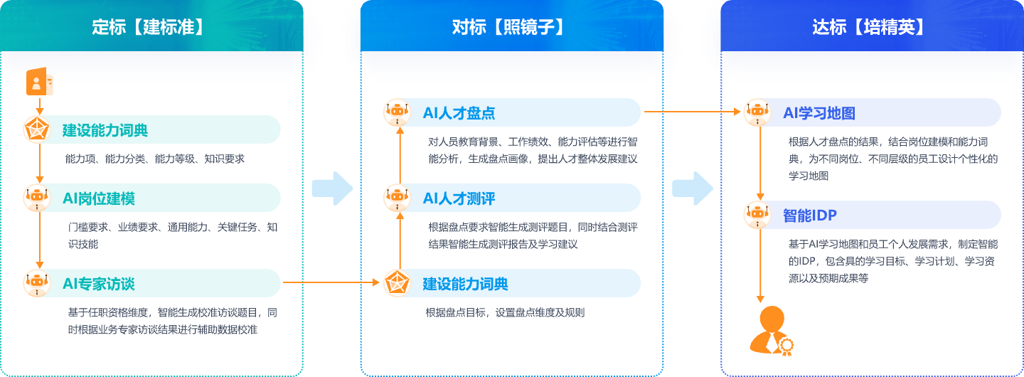 AI+学习发展平台以AI数字化平台为核心,搭建人才盘点、培训资源、运营、可视化数据为一体的赋能体系。