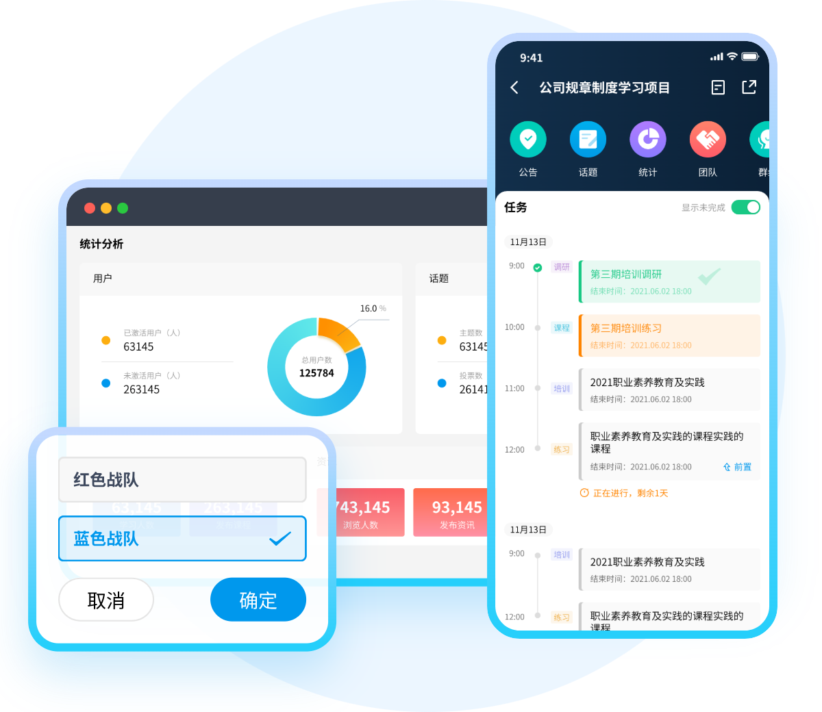 多种学习活动组件自由组合,课程、考试、练习、班级、直播、调研、招募、评价、表单、签到、投票、实操、专题、评估、作业等,随需调用,让培训项目搭建更快捷