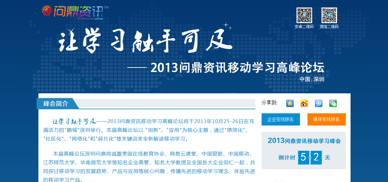 "让学习触手可及--2013问鼎资讯移动学习高峰论坛"将于2013年10月25-26日在充满活力的"鹏城"深圳举行。本届高峰论坛以 "创新"、"应用"为核心主题,通过"绩效化"、 "社区化"、"网络化"和"碎片化"等关键词来全新解读移动学习。