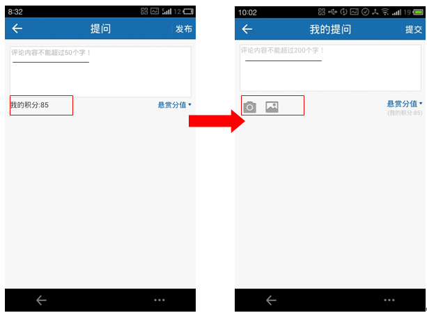 在"问答"中"提问"功能的主要改变是新增上传照片功能。用户可以选择以拍照的形式或直接在相册中选择照片进行上传发布。除此之外,提问的字数从不超过50字增加到200字。