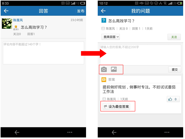 "回答"新增图片功能,并且提出者打开问答详情时,可以将好的回答"设为最佳答案"。设置最佳答案后,"设为最佳答案"不再显示,最佳答案显示在所有答案的最前面并与其他回答分开。