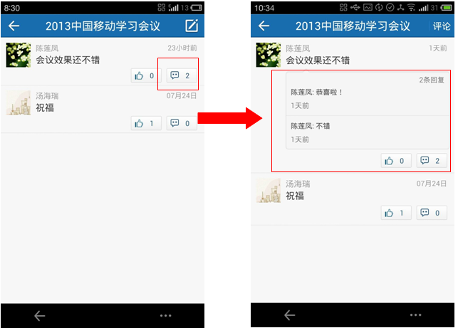 在1.3版本中,评论功能进行了优化。其中评论的回复,在改进之后,不仅能显示回复条数,也能将回复的内容显示2条出来,方便用户了解回复内容。