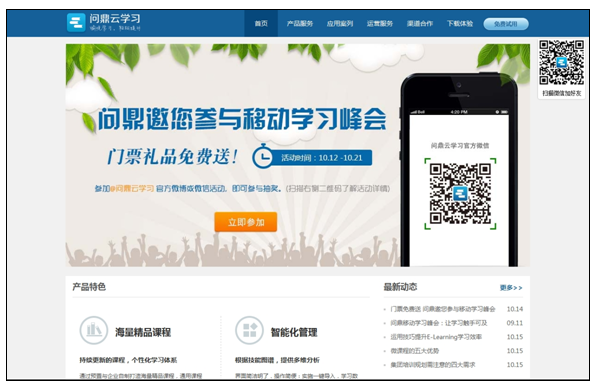 新版官方网站更简洁,重点展现了问鼎云学习的产品特色、最新动态、活动专题及客户。
