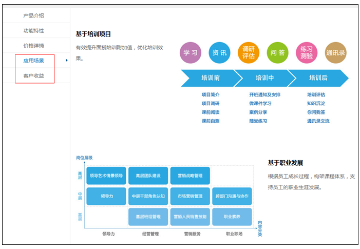 产品介绍页面中,增加应用场景及客户收益。应用场景中加入问鼎云学习适用的项目场景,例如基于培训项目;客户收益分角色为客户展示了使用云学习可以带来的收益,同时展现了云学习产品价值,为客户更深层了解云学习提供了便利渠道。
