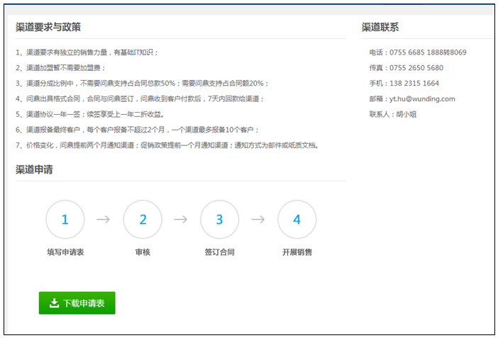 新版网站提供渠道合作页面,为渠道代理商提供网上申请入口。同时详细描述了渠道要求、政策以及渠道申请流程和渠道联系人欢迎大家积极代理问鼎云学习产品。