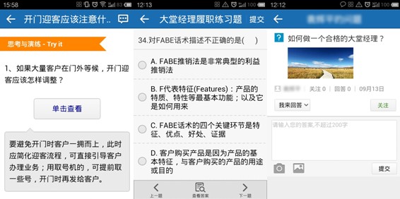 及时复习巩固:同时结合网点实际工作遇到的问题,可以有针对性地学习对应知识。如在厅堂中遇到的投诉,可以通过投诉处理技巧和方法的学习,尽可能及时有效地解决投诉问题,而且每一知识点后面紧跟着案例的学习和知识点的复习回顾,能够对知识进行及时巩固。通过测试题库的测验,能够让学习者了解自身对于知识点的掌握情况,便于制定下一步的学习计划。