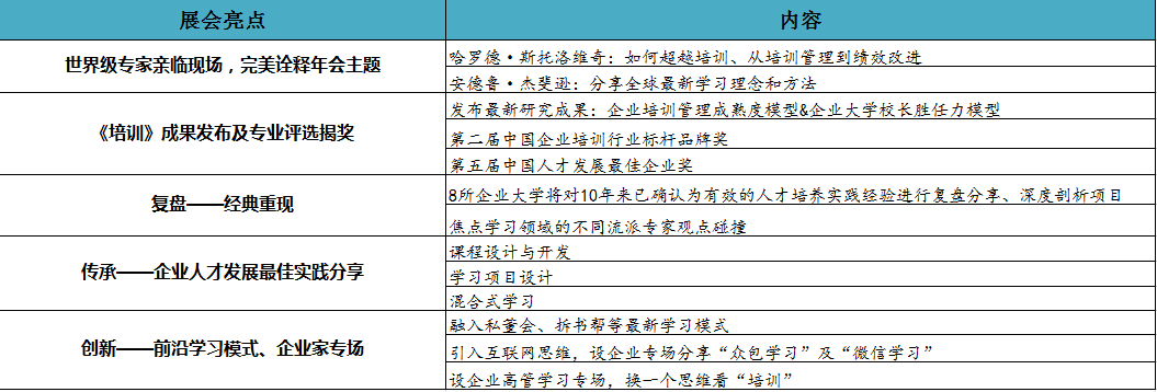 本届年会将邀请培训专家重新审视近年来引领行业发展的经典学习技术和方法论;邀请国际大师分享全球最新学习理念和方法;邀请知名企业家探讨培训学习的本质;发布企业培训行业的评选结果和最新研究成果。值得注意的是,京东大学的"众包学习模式"和中信银行信用卡中心的"微信学习",私人董事会、拆书帮等学习方式,将会给与会者在学习创新上更多启发。