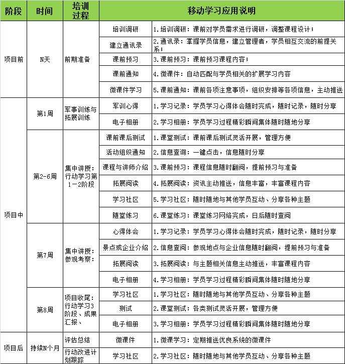 从"项目前"的学员管理工作(如:学员信息,学习通知,学员报到,建立同学录等)到学习管理(课前调研,课前预习,拓展阅读等),再到"项目中"和"项目后"过程监控(随堂练习,结业测验,心得交流等),可以深入到培训实施的每个细节之处。