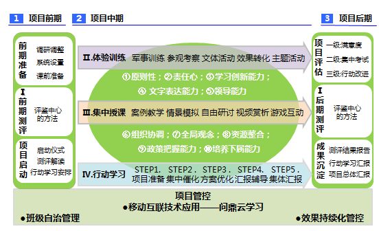 从平庸到优秀,项目已经迈出了第一次的跨越,如何让项目实现由优秀到卓越的转变,培训管理人员决定大胆创新,提出了流程优化和形式创新两个具体要求。一方面转变过往偏橄榄球式的项目管理方式,向哑铃型管理转变,另一方面,创新学习形式,引入企业移动学习应用,提升学员的参与热情,强化培训过程管控。