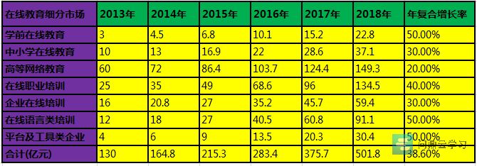 对于预测模型依据何来?这是吕森林老师根据十多年从事在线教育的经验,从收集到的各类信息经过观察和推论而得。需要说明的是这里尚未把教育信息化行业计算计入。另外由于互联网历来是高风险的领域,因此本数值谨供投资者和创业者参考。